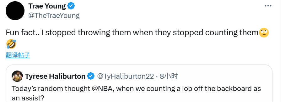 特雷·杨评论道:“一个有趣的事实,当他们不把这个算作助攻时,我就不传打板空接了。”
